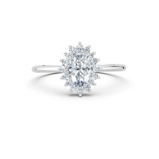 Verlobungsring mit ovalem Mittelstein und rundem Diamanten im Blumen-Halo-Stil