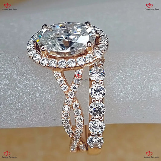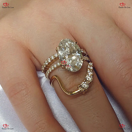 Ovaler Vintage-Verlobungsring mit zertifiziertem Moissanit - Hybrid Crushed Ice Solitaire aus massivem Gold mit Diamant-Trauringen