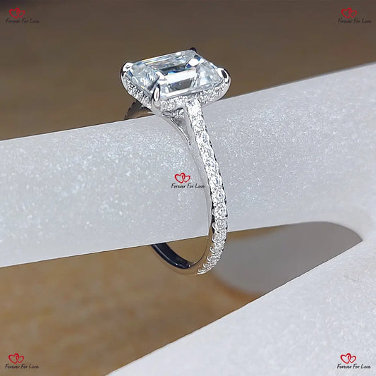 Moissanit-Verlobungsring mit Smaragdschliff und Doppel-Halo | Ewigkeitsring | Moderner Verlobungsring mit Pavé-Diamanten