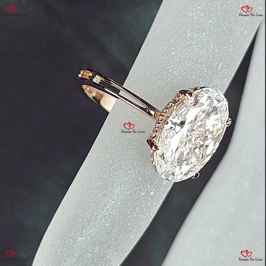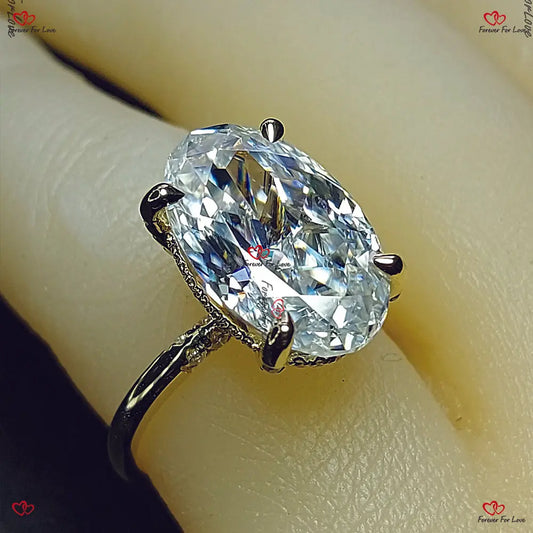 Ovaler Crushed Ice Moissanit Verlobungsring - Länglicher Diamant versteckter Halo mit doppelter Krappenfassung