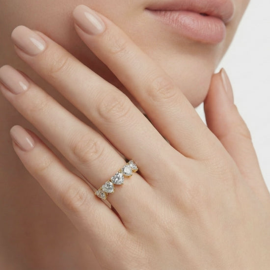 Embrace the charm and elegance of the Solid Gold Heart Five Stone Heart Cut Diamond Ring from Forever For Love. This exquisite wedding band features five heart-shaped lab-grown diamonds, totaling 1.5 carats, set in solid gold. With its EF color and VS clarity, each heart-shaped diamond adds a touch of romance and sophistication to this stackable ring design.