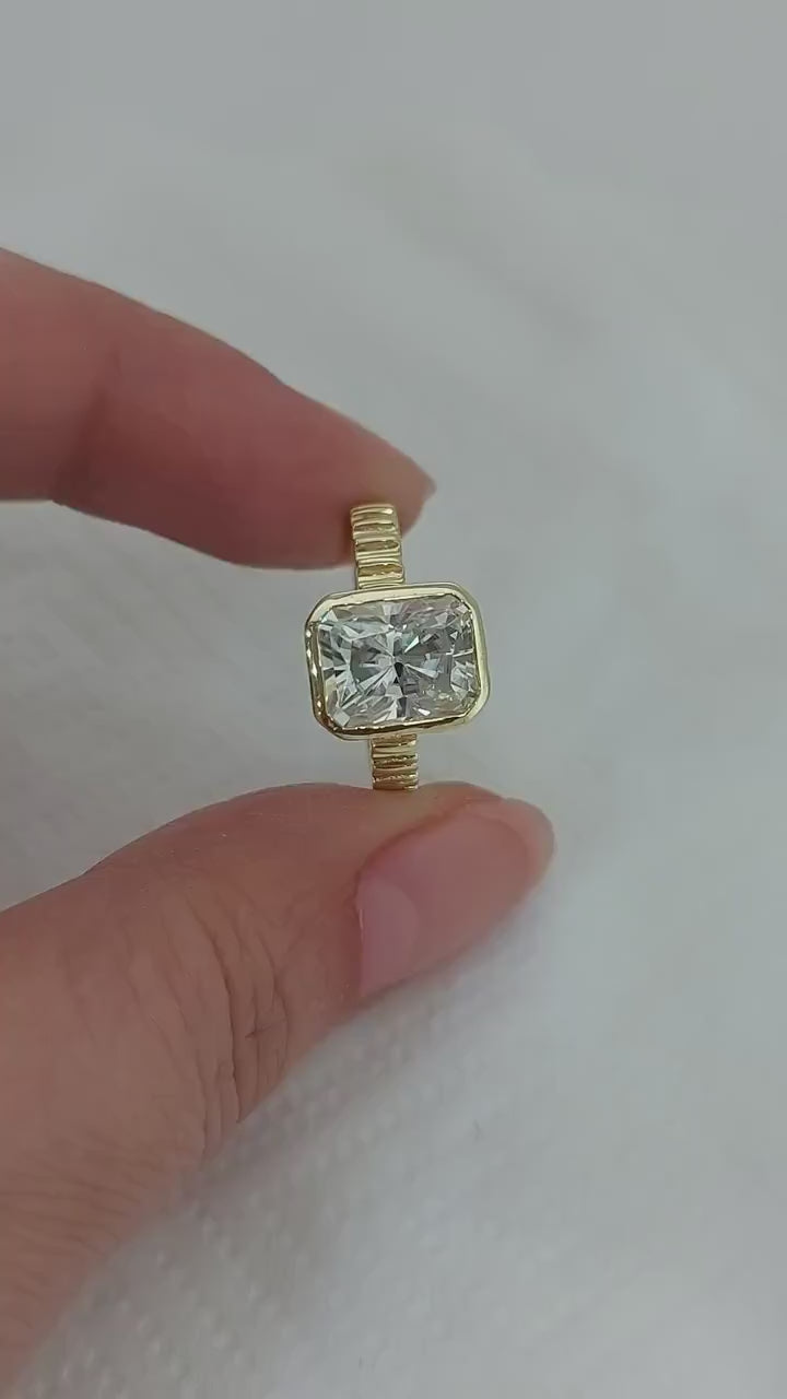 A touch of vintage romance meets modern brilliance in this 1.5 Carat Radiant Cut Moissanite Engagement Ring. The bezel setting highlights the stone’s geometric sparkle while offering a sleek, secure, and timeless silhouette. Crafted for the woman who adores classic charm with a contemporary twist, this ring radiates elegance and individuality.