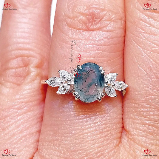 Bague de fiançailles ovale en agate mousse naturelle avec accents de diamants marquise