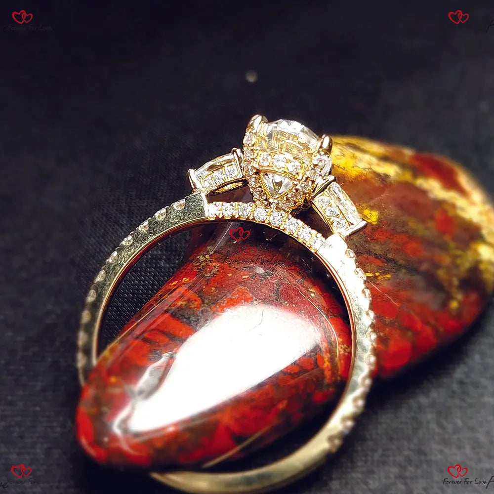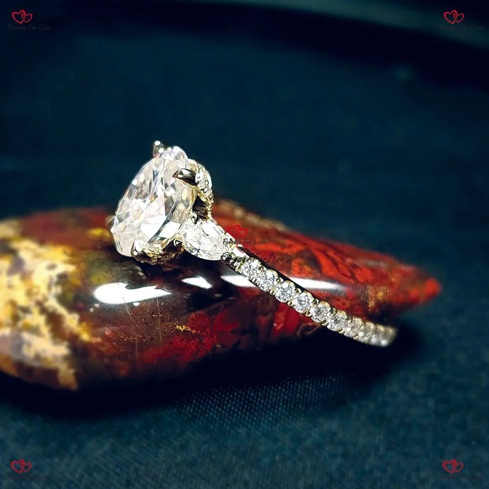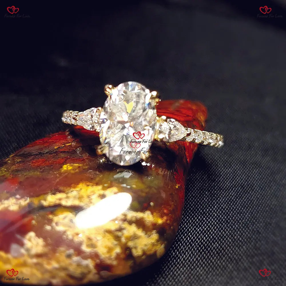 Bague de fiançailles antique en moissanite ovale | Ovale taille brillant | Or jaune vintage | Bague trilogie diamant poire
