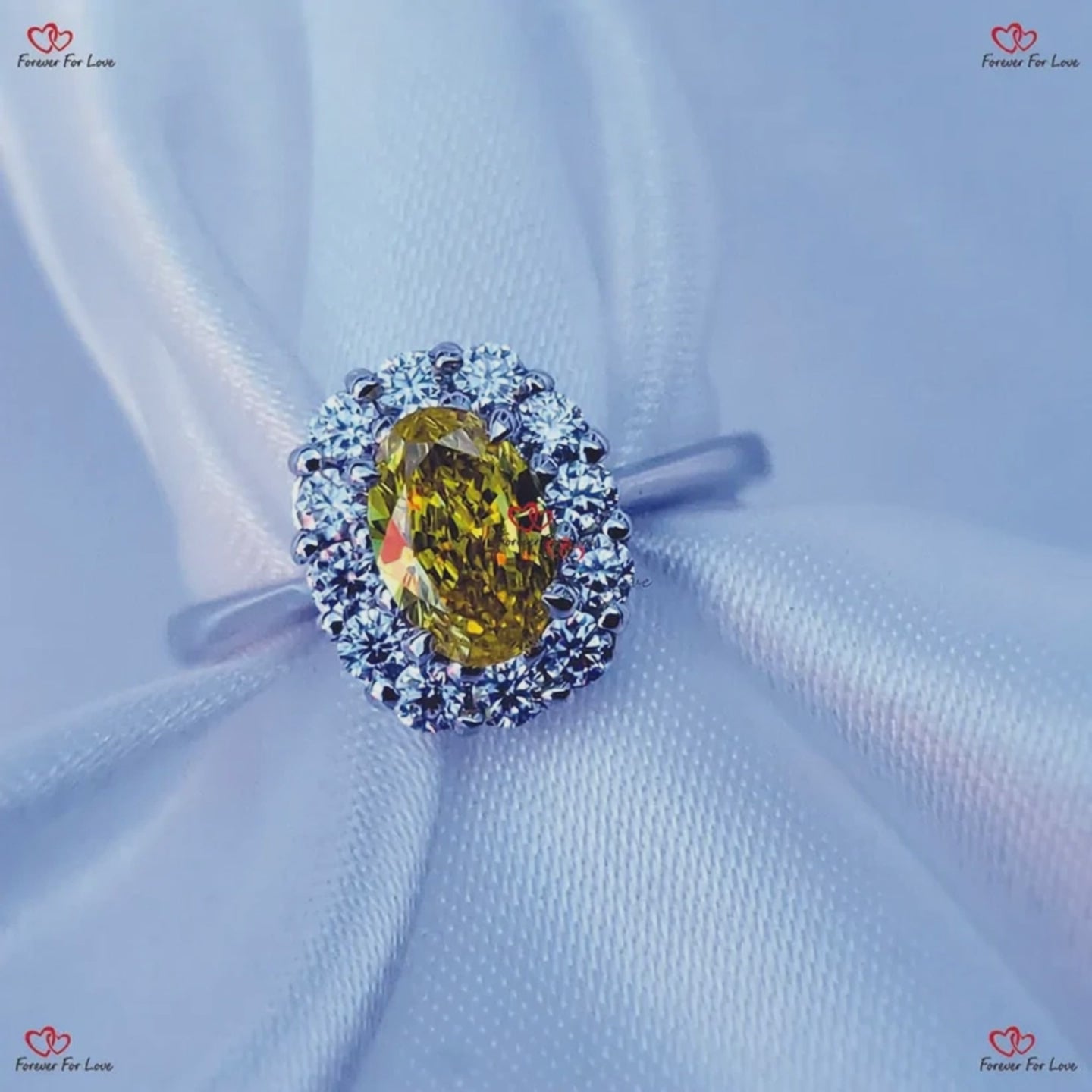 Bague de fiançailles avec diamant taille ovale jaune fantaisie et halo
