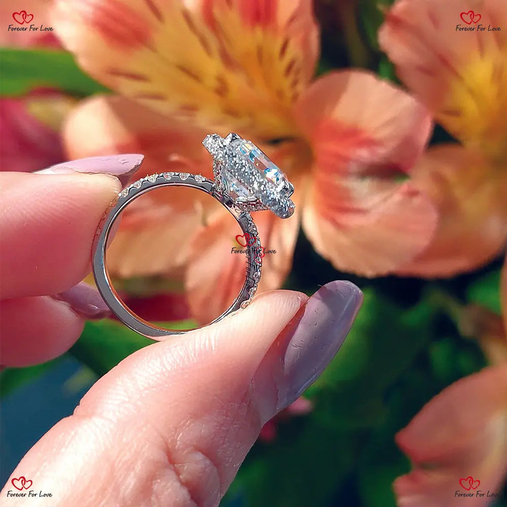 Bague de fiançailles en moissanite à double halo taille émeraude | Bague Forever | Bague de fiançailles moderne avec pavé de diamants