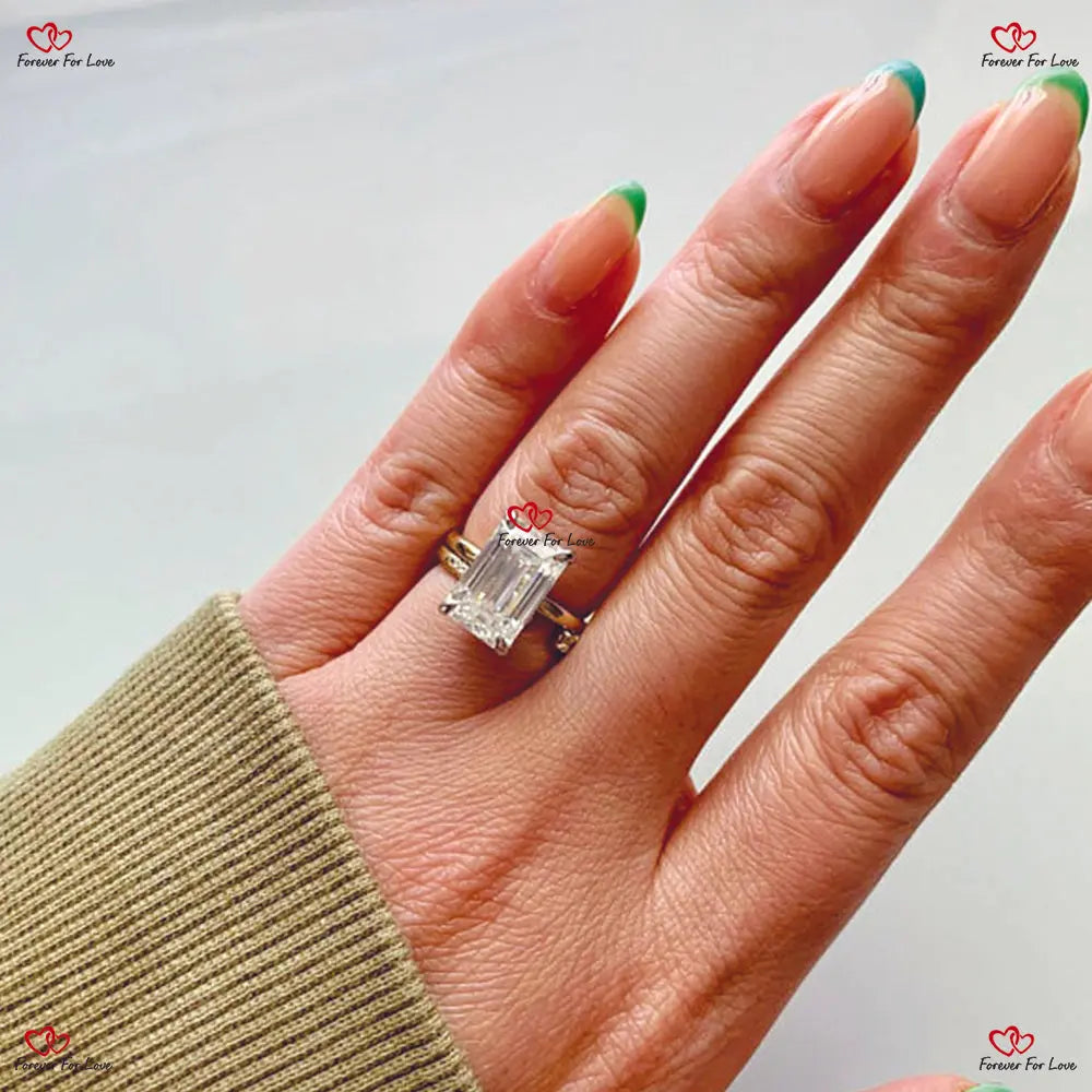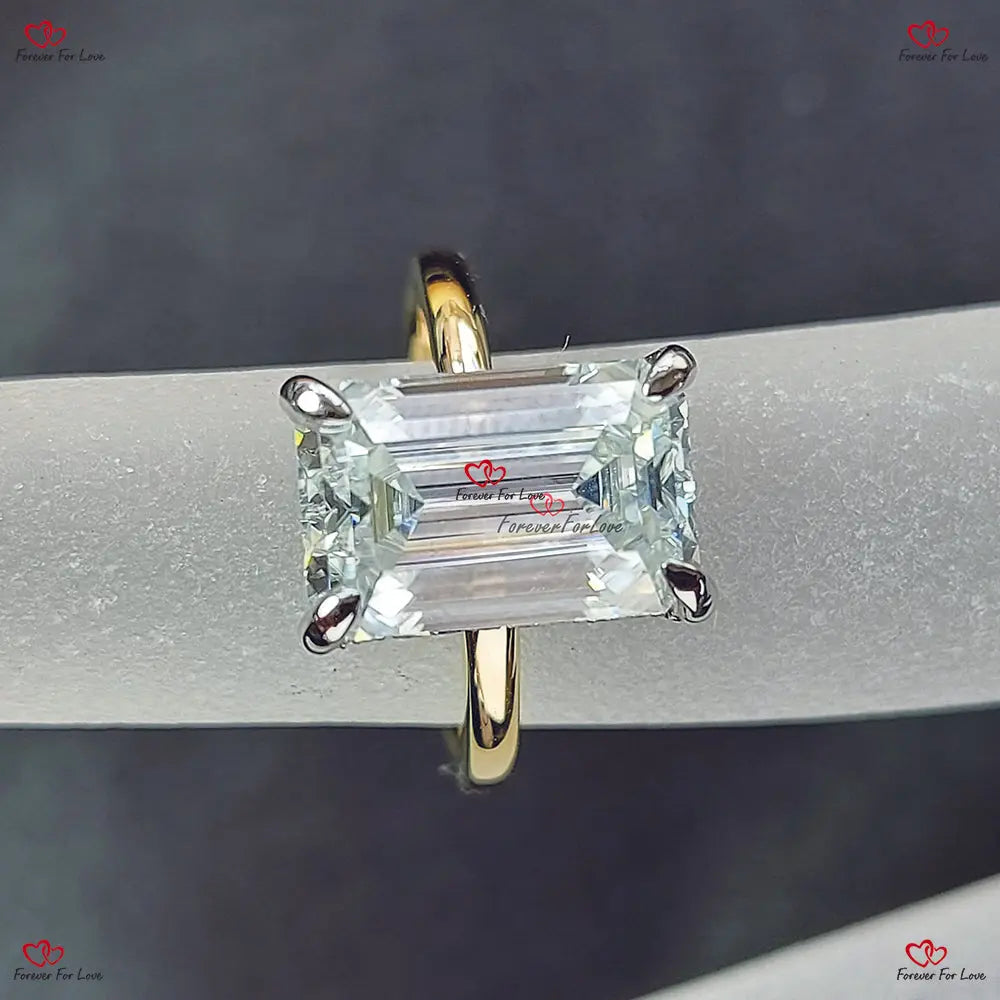 Bague de fiançailles bicolore en or massif avec moissanite taille émeraude et diamant